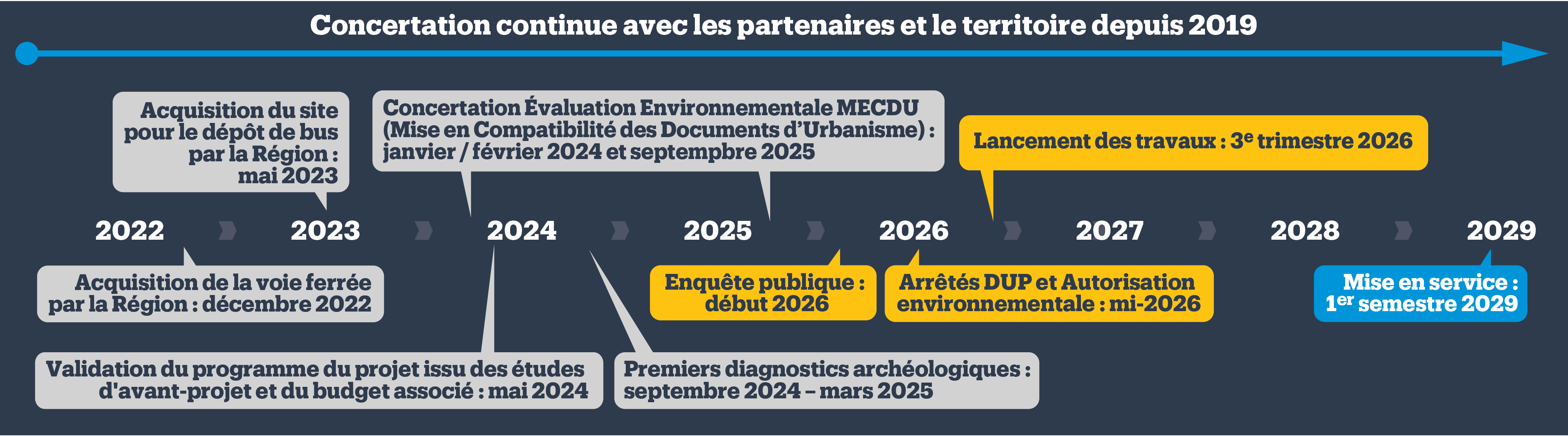Depuis 2019, plusieurs phases d’études, de processus réglementaires et de dialogue avec les partenaires et les riverains sont menées dans le but d’affiner le projet et de répondre au mieux aux besoins des habitants et du territoire.