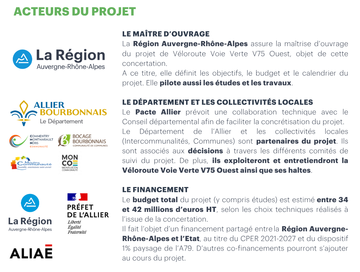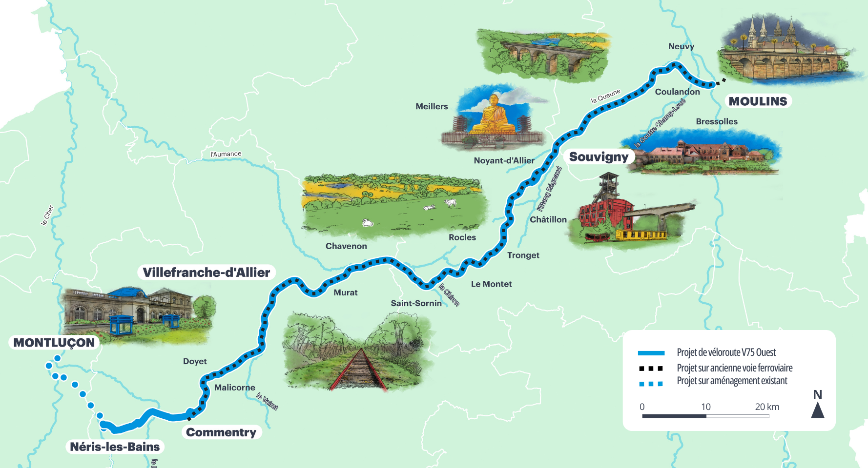 La V75 est un itinéraire cyclable existant, inscrit au Schéma national des véloroutes voies vertes, qui traverse le département de l’Allier d’est en ouest, principalement par jalonnement sur des routes existantes. C’est dans une logique de développement économique et touristique durable que les acteurs territoriaux ont souhaité le transfert de cet itinéraire sur un site propre aménagé, avec l’opportunité de réutiliser la ligne ferroviaire aujourd’hui désaffectée entre Commentry et Moulins. Cette véloroute reliera ainsi les villes de Moulins et Montluçon grâce à une connexion avec la voie douce déjà existante entre Néris-les-Bains et Montluçon.